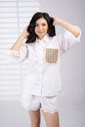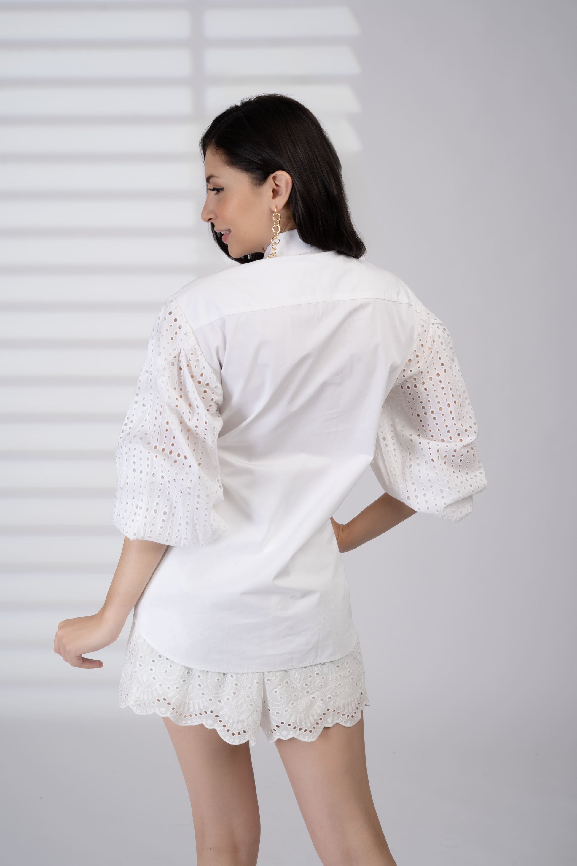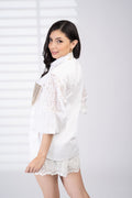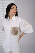 Scalloped eyelet lace sleeves in a popplin shirt and a mesh & jute-detailed pocket reinvent white-on-white dressing for the tropics. Ultra-breathable with a crafted finish.