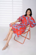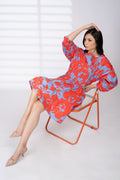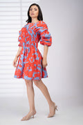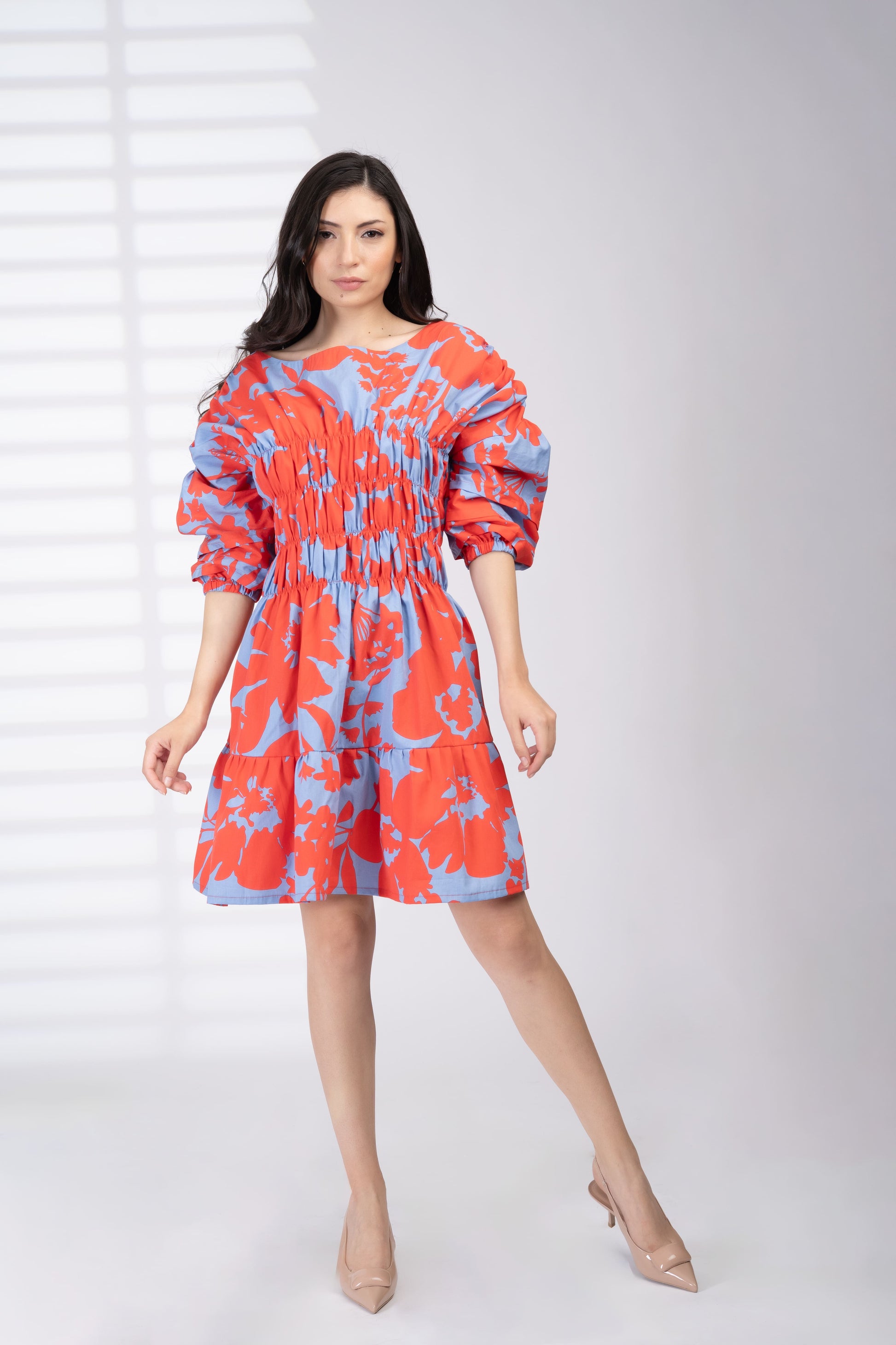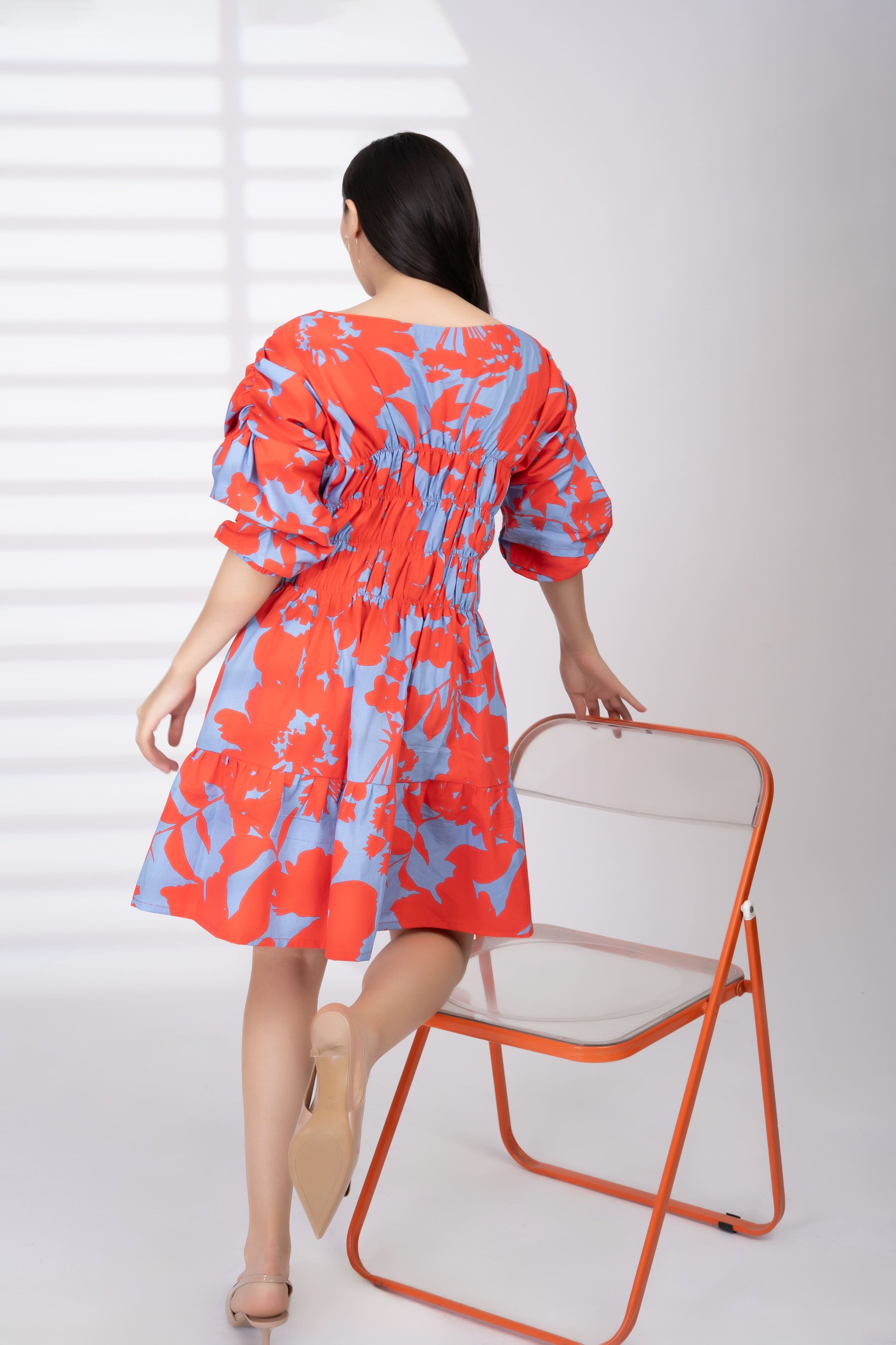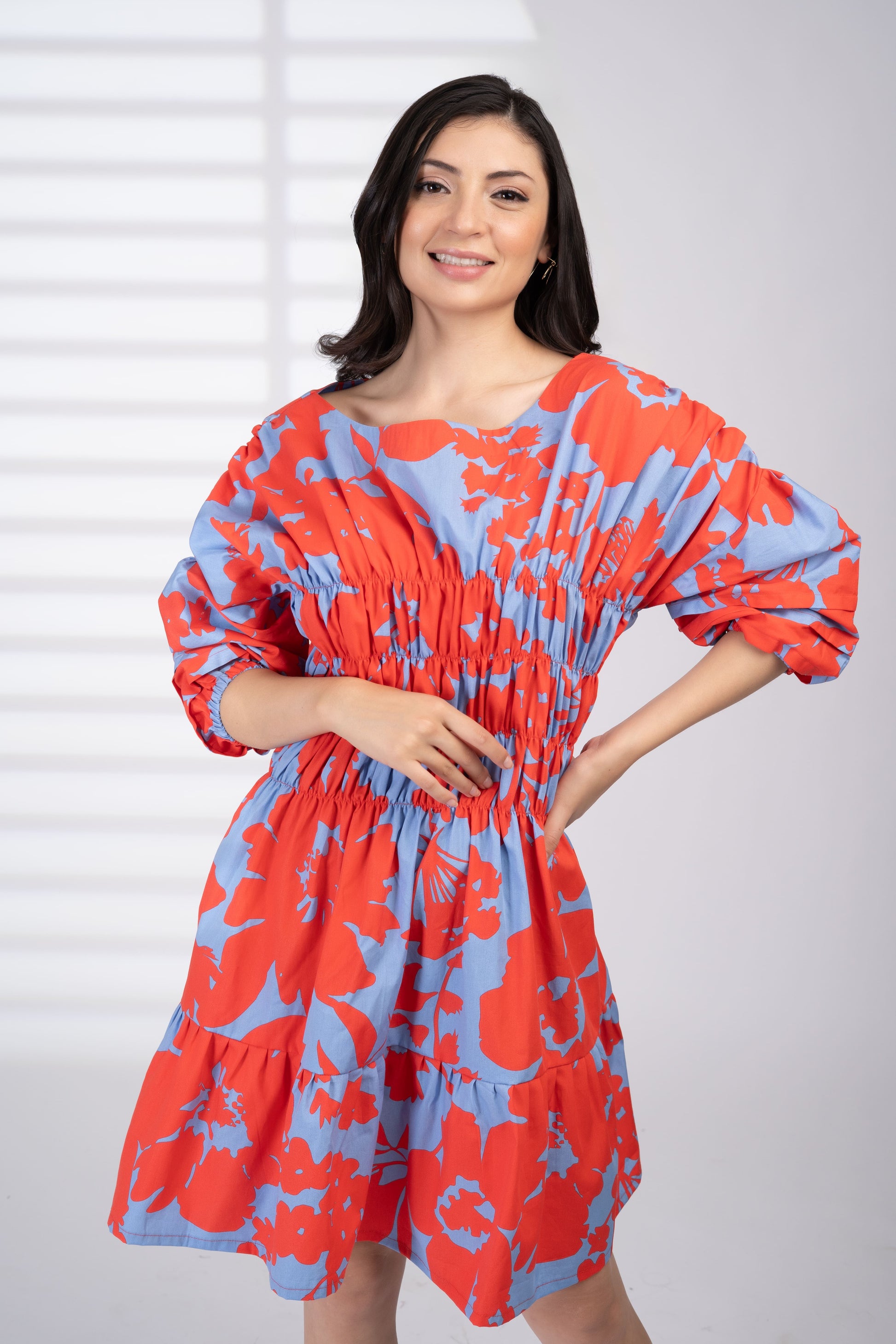 A red-and-blue floral print dress with gathered detailing—made in airy cotton popplin, it evokes summer fiestas and tropical reveries.