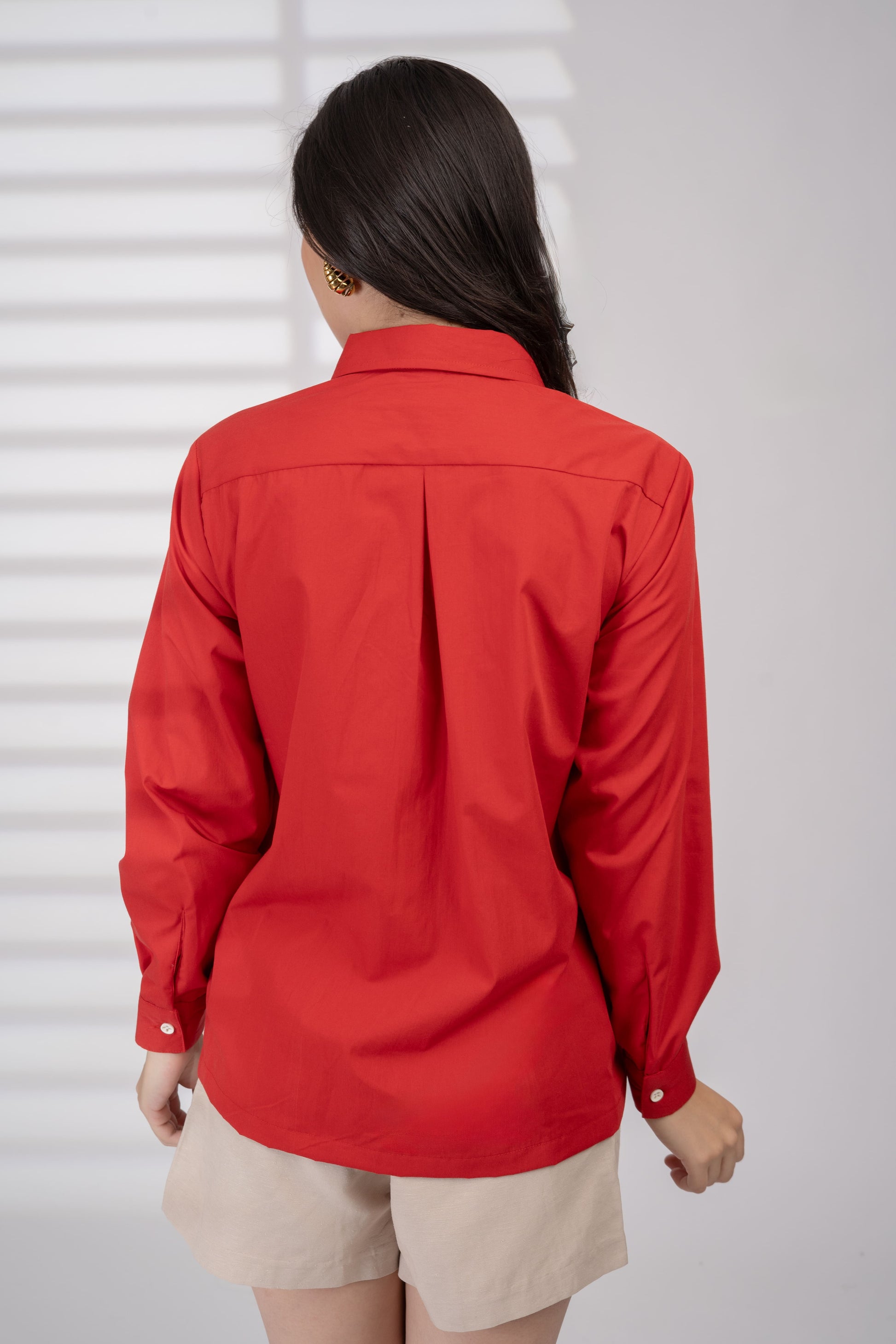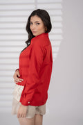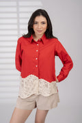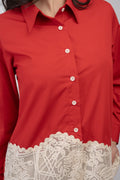 This scarlet shirt is finished with delicate ivory crochet lace fabric—a bold yet timeless pairing that echoes sunset cocktails by the beach.