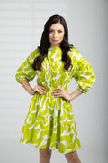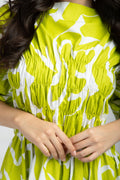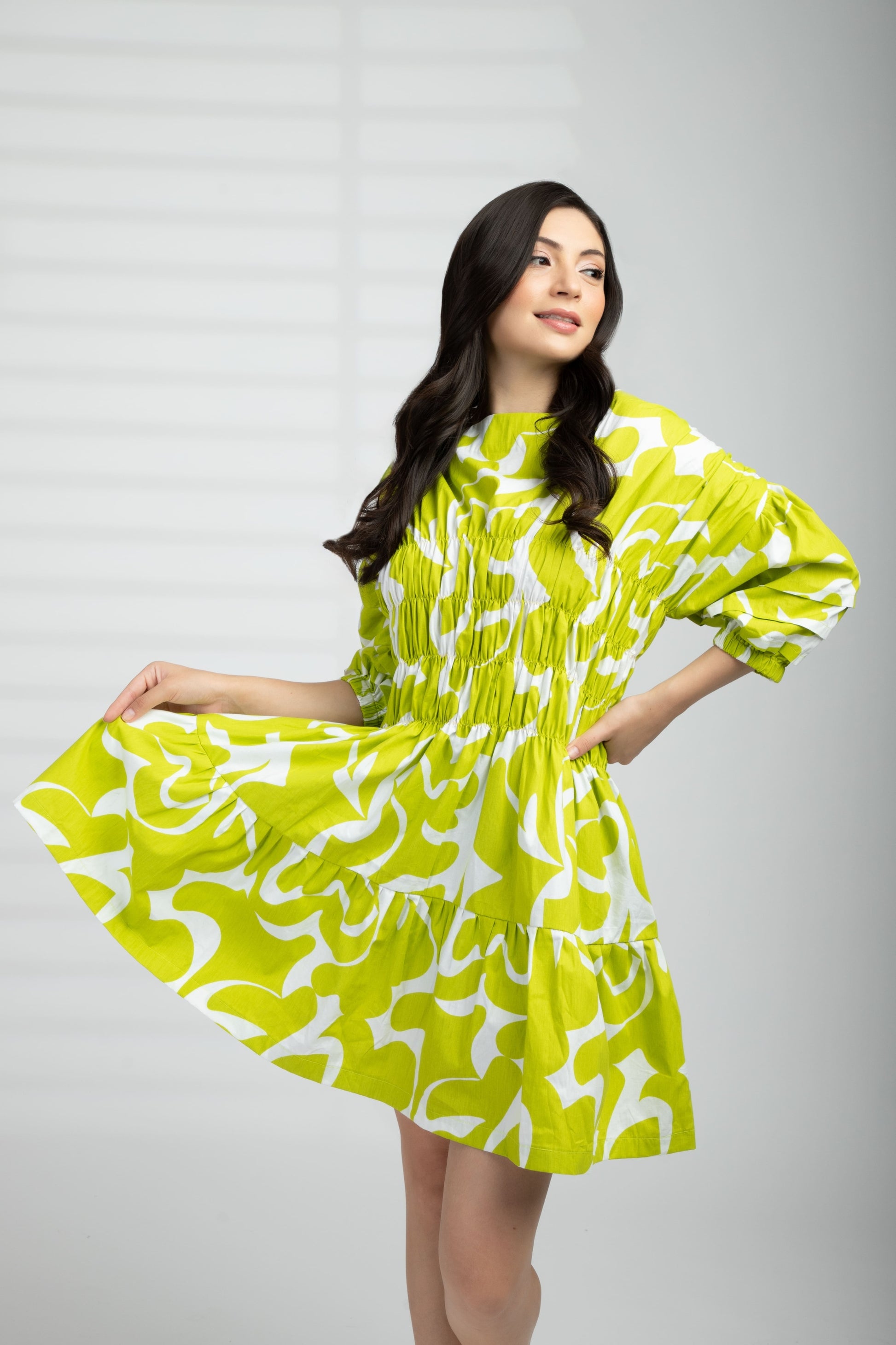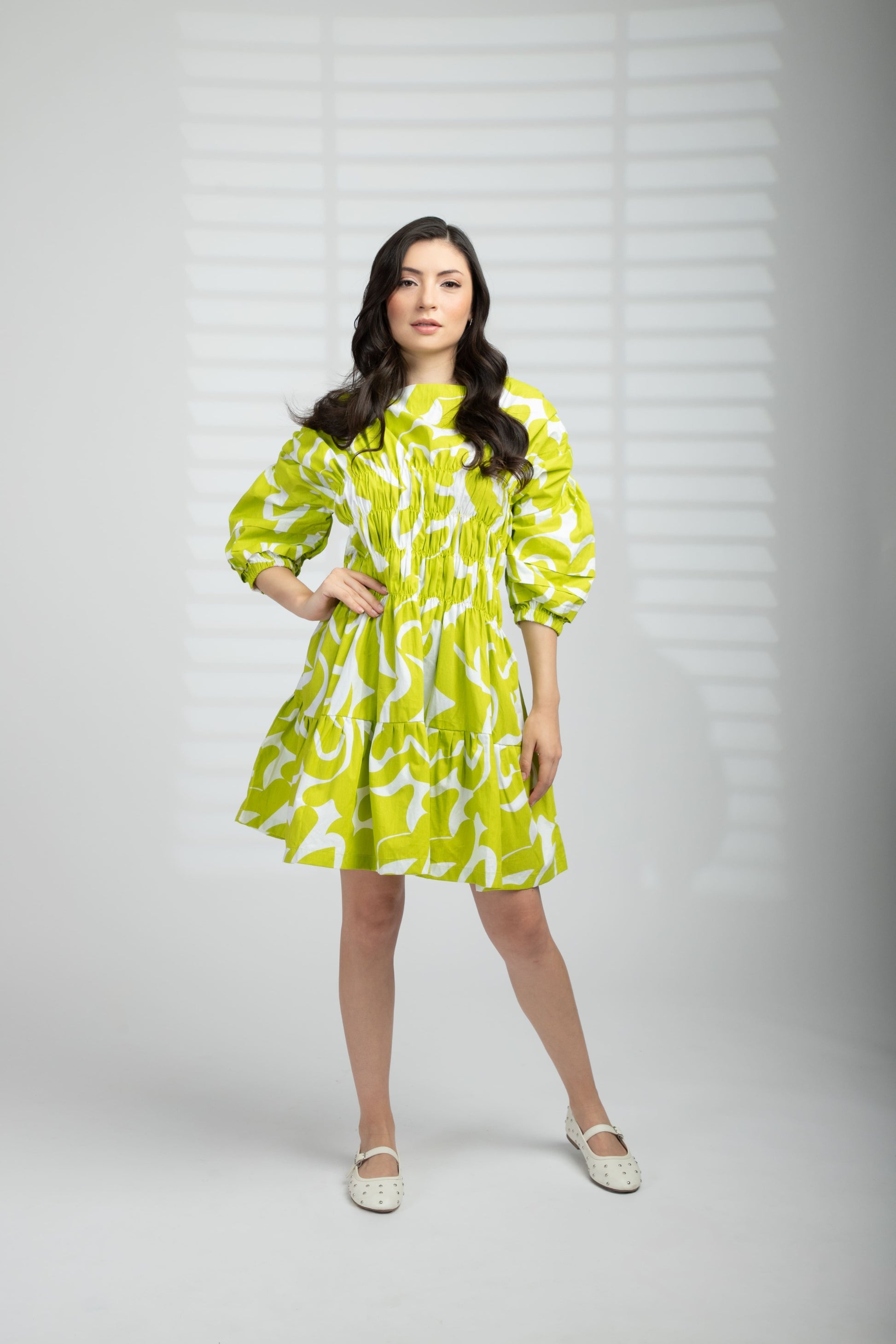 A lime-green floral dress, ruched and tiered—crafted in popplin, it embodies zest, spontaneity, and barefoot elegance.