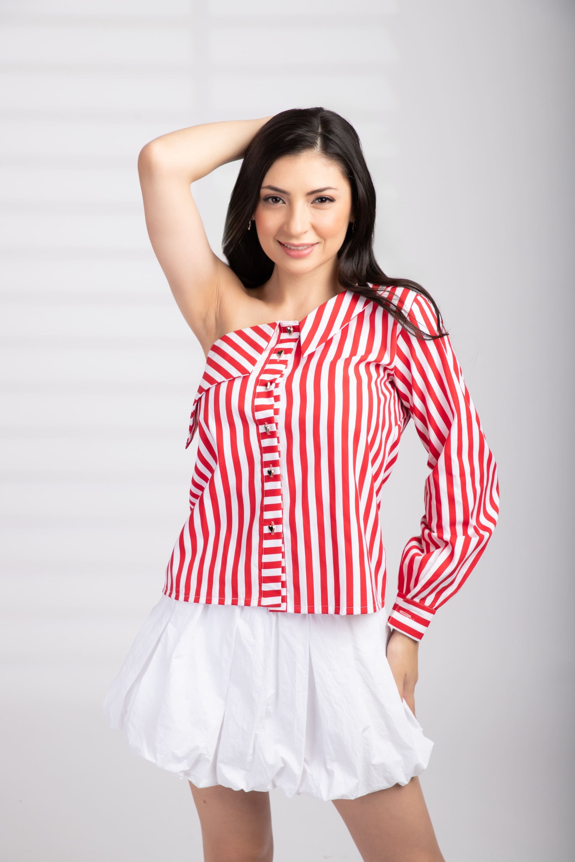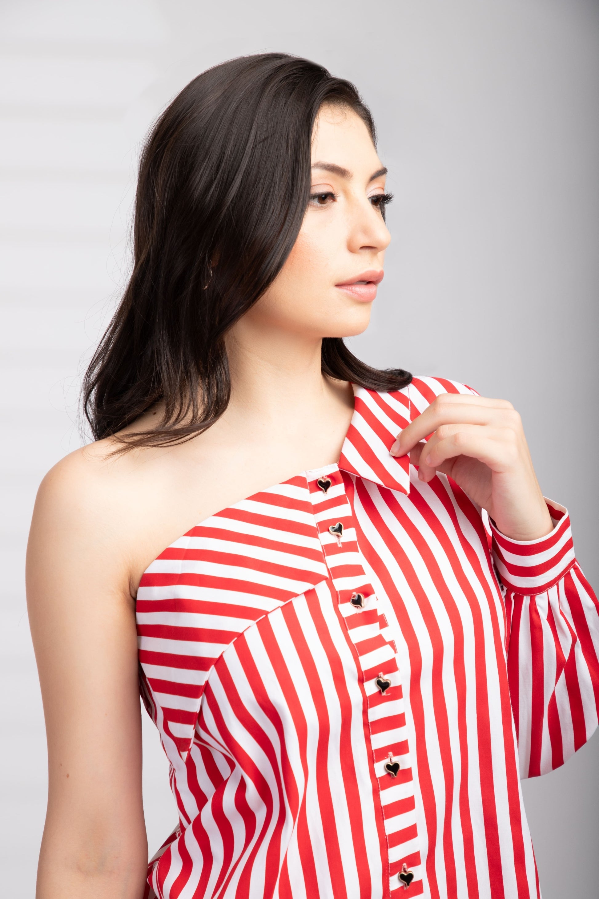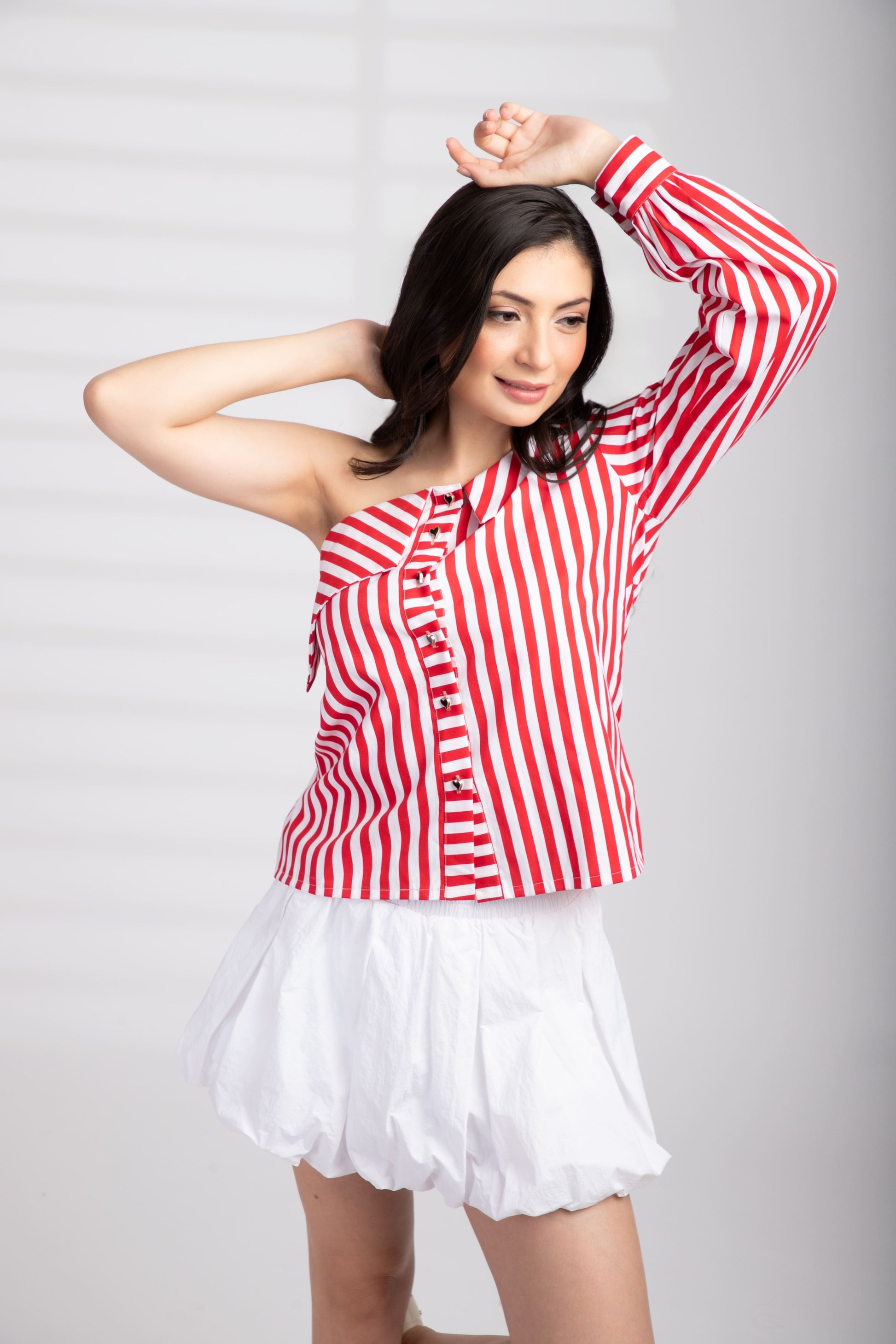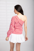 A playful asymmetric one-shoulder top in red stripes perfect for rooftop brunches and yacht-side views.