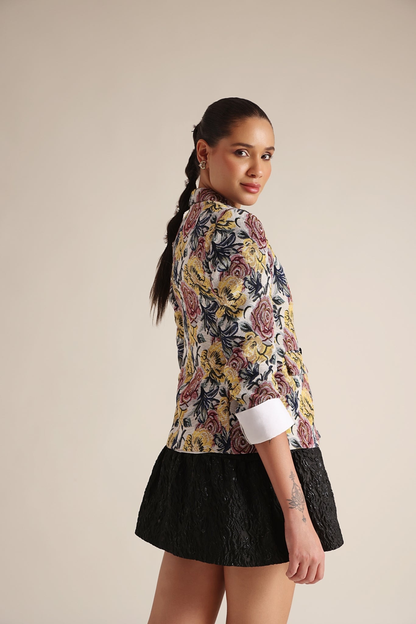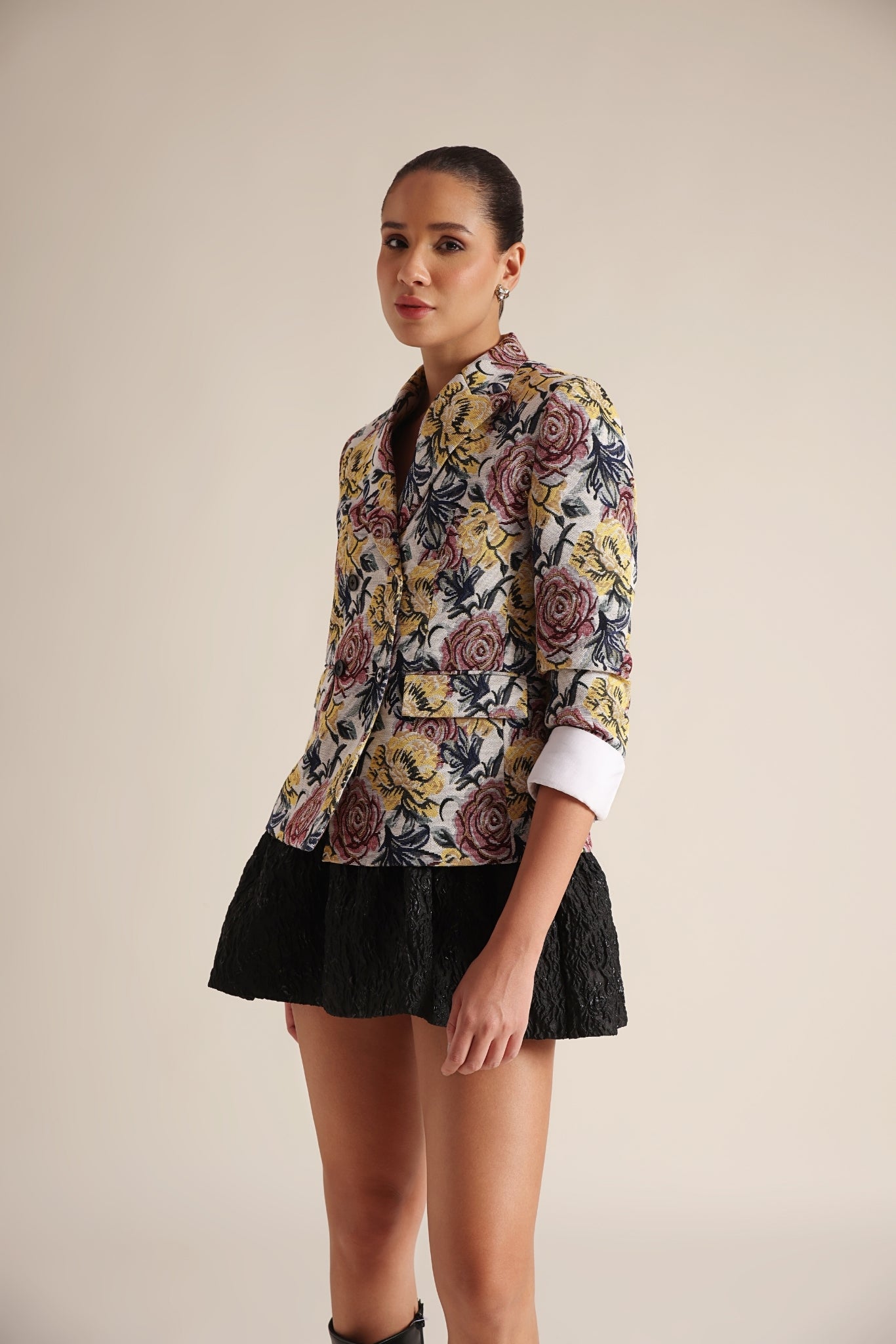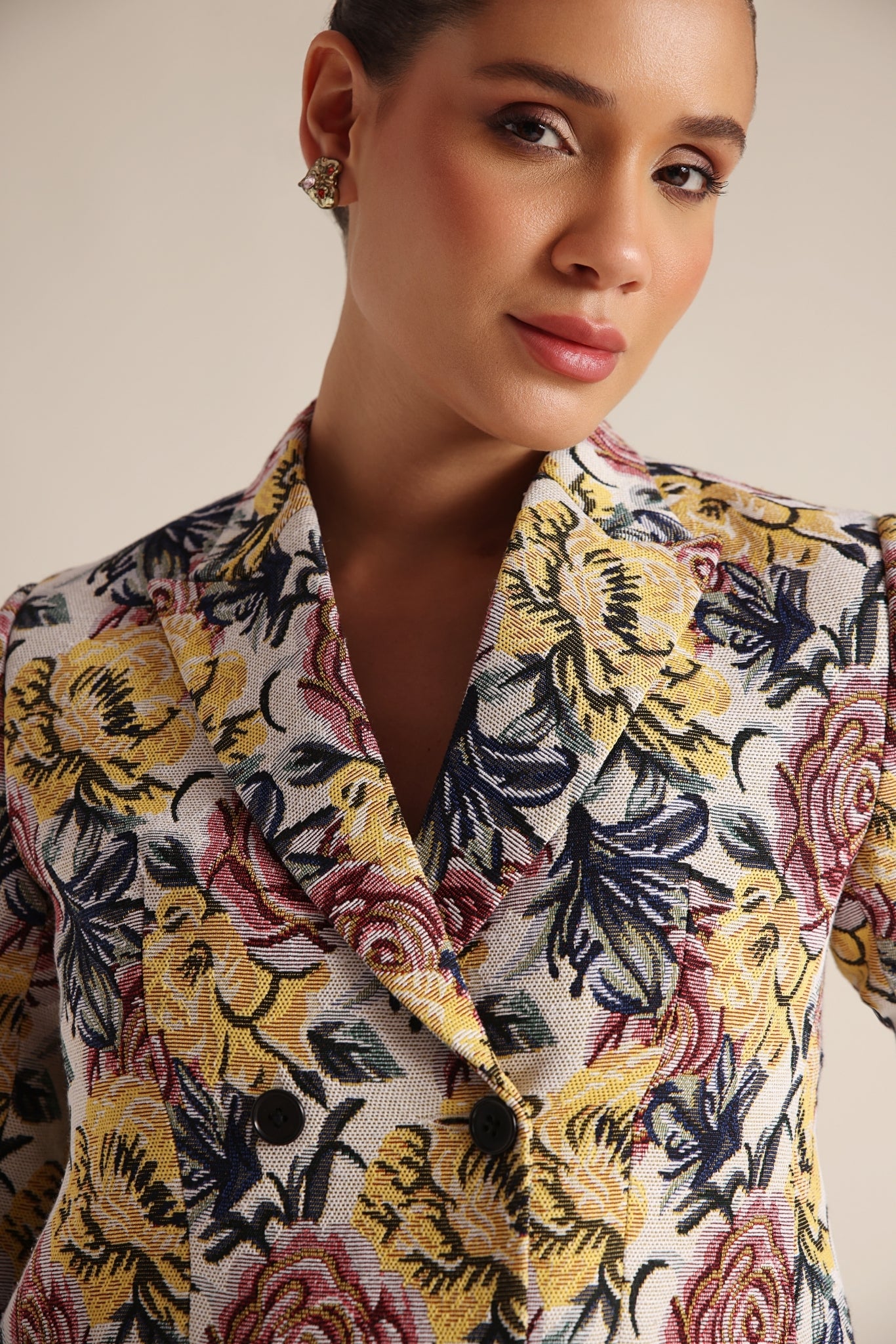 A playful vibrant blazer adorned with a floral pattern.