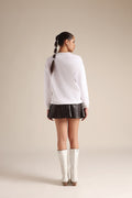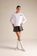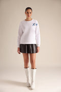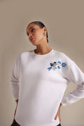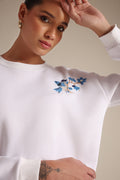 A clean white sweatshirt elevated with a delicate cluster of blue floral embroidery on the shoulder.