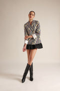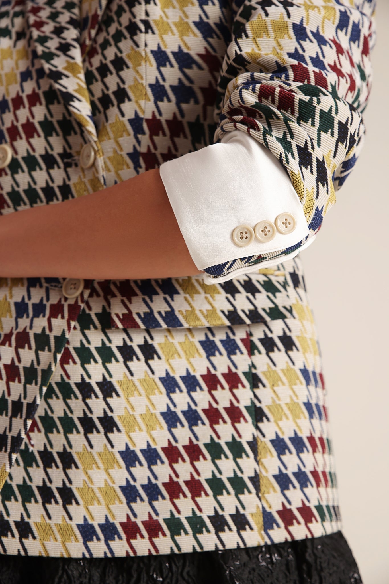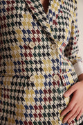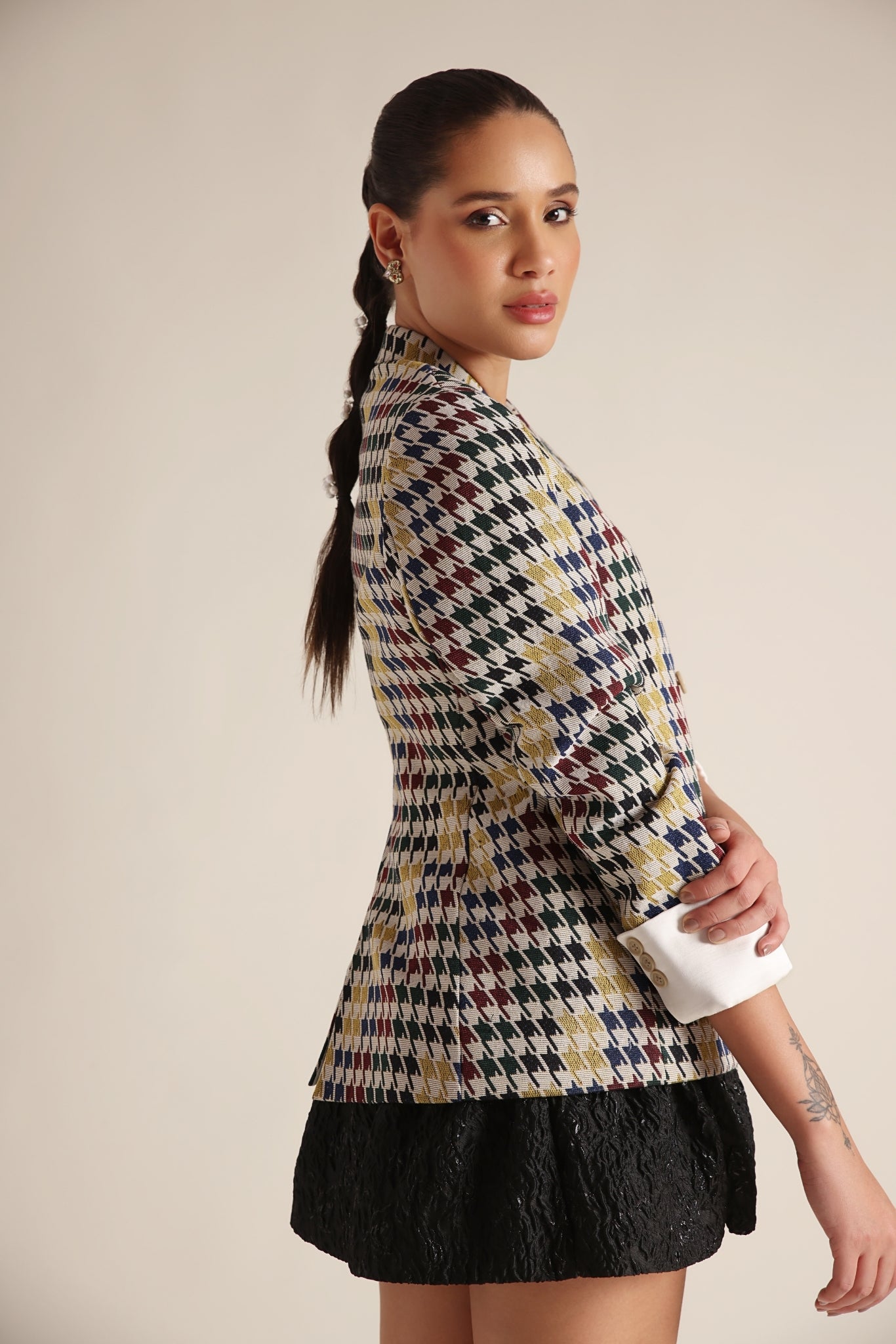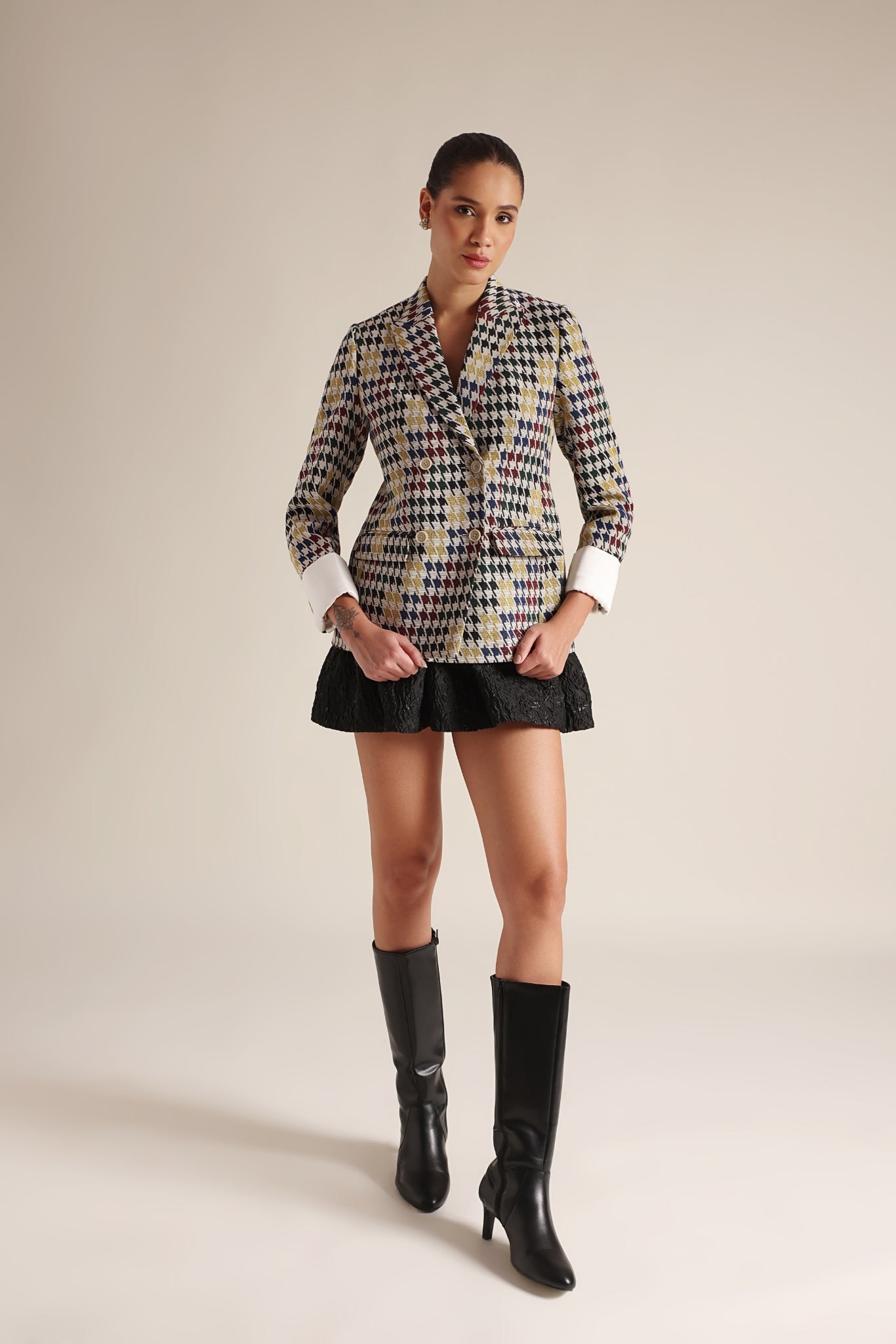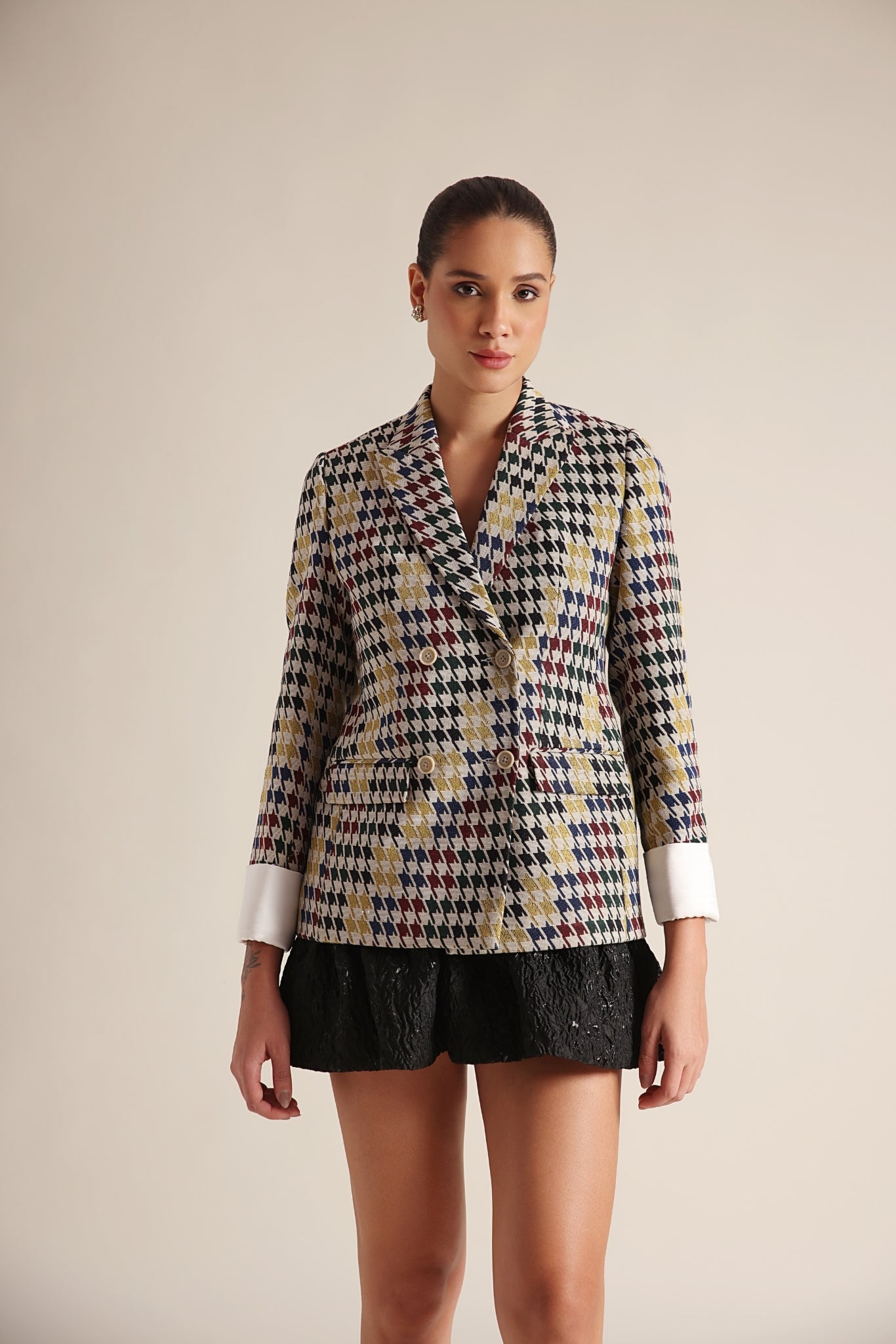 A bold multicolor houndstooth blazer that brings a modern twist to a timeless classic.
