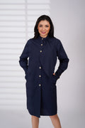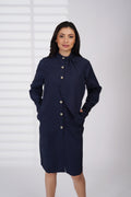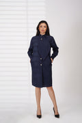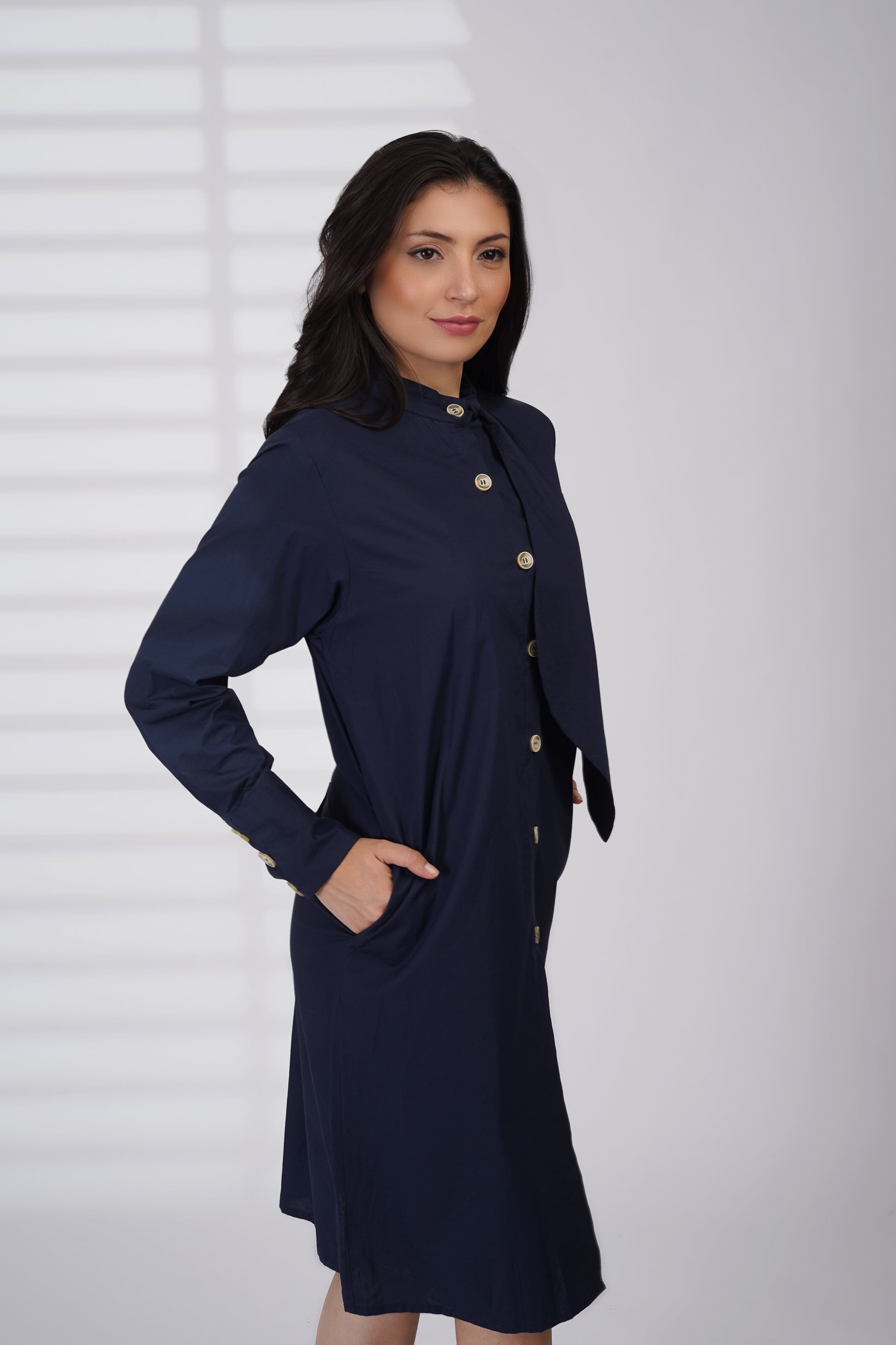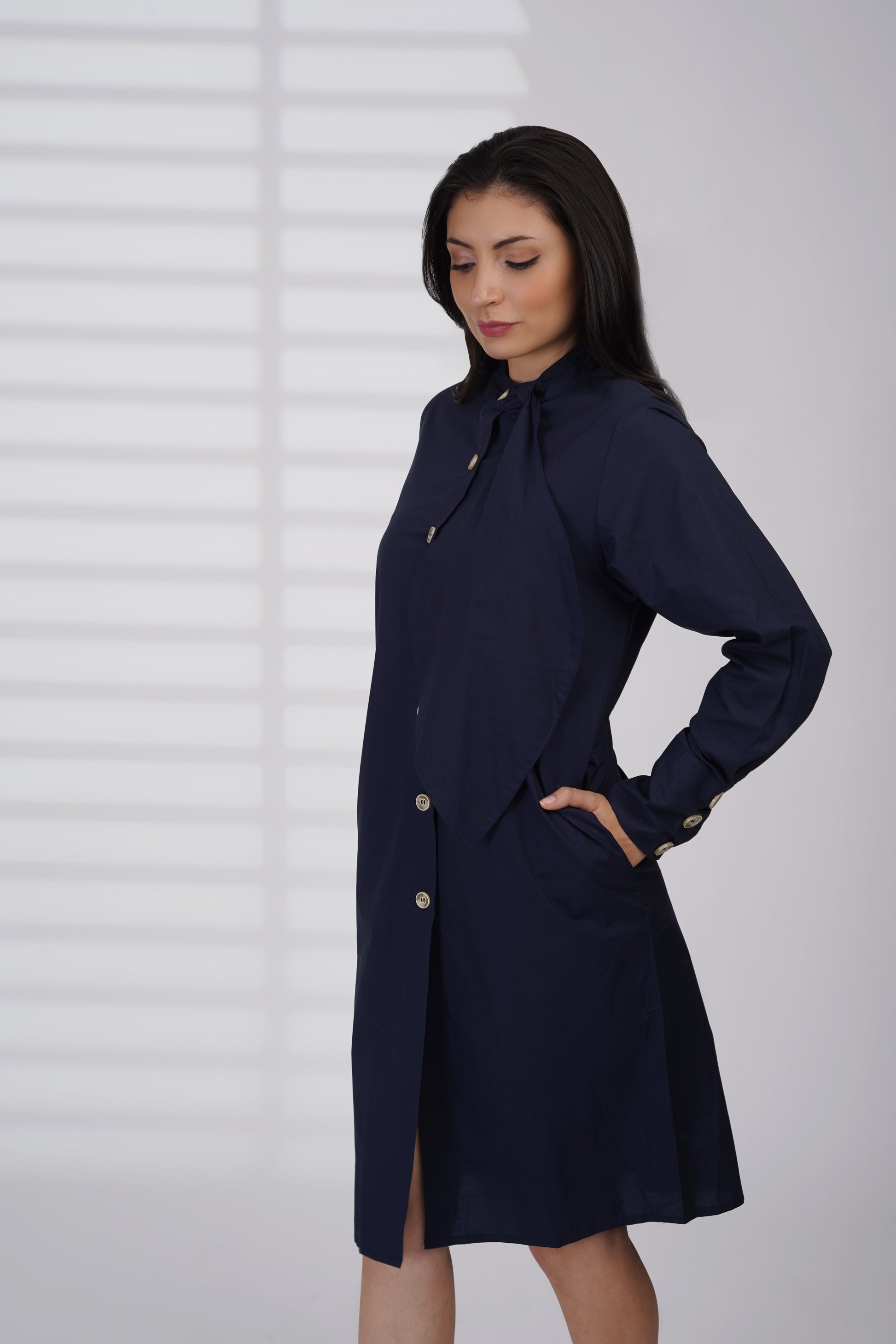 A sleek navy dress designed with a clean silhouette and a modern front drape detail. Finished with a stand collar, button-down front, and subtle side pockets, it offers effortless elegance for work or any polished occasion.