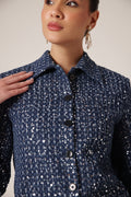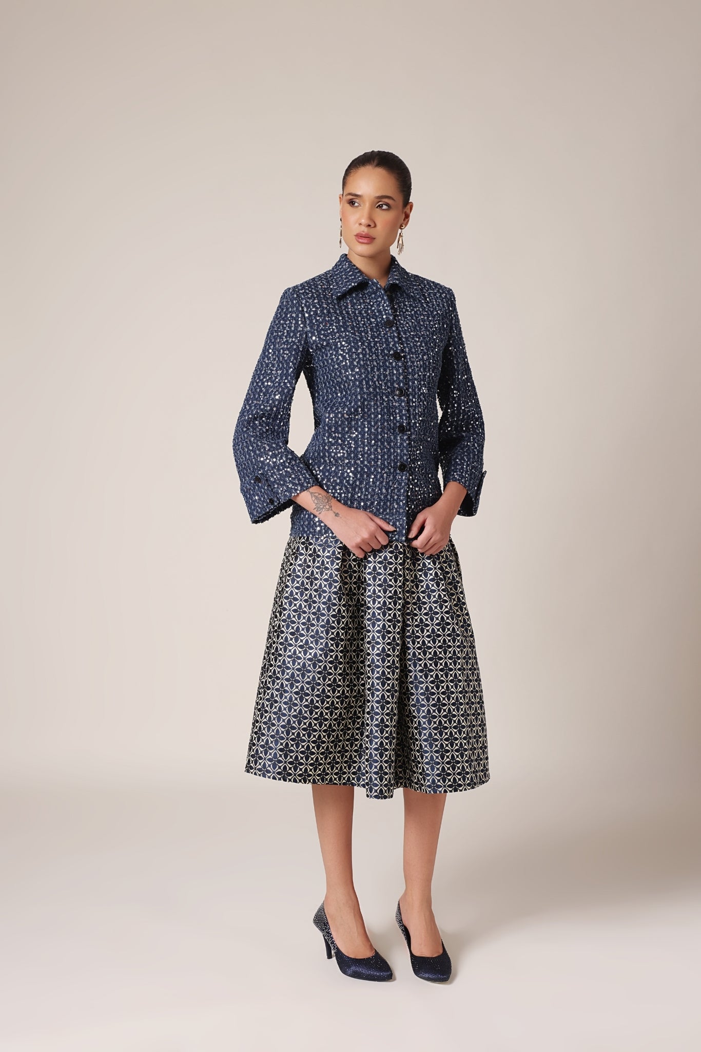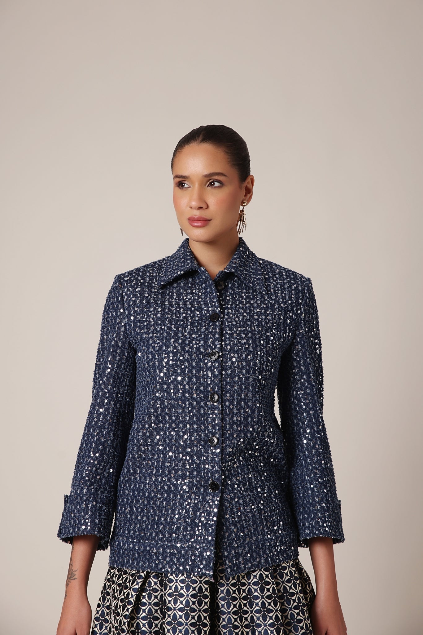 A refined blazer crafted in navy patterned fabric for a polished, luxe day-to-evening look.