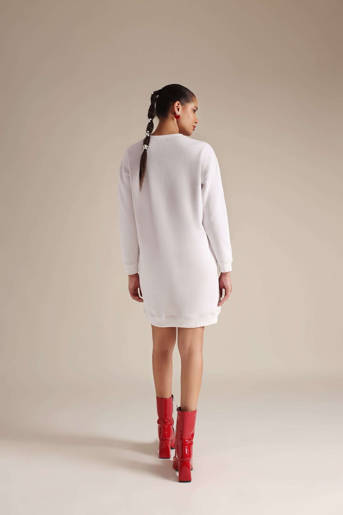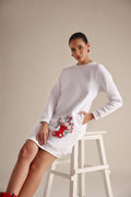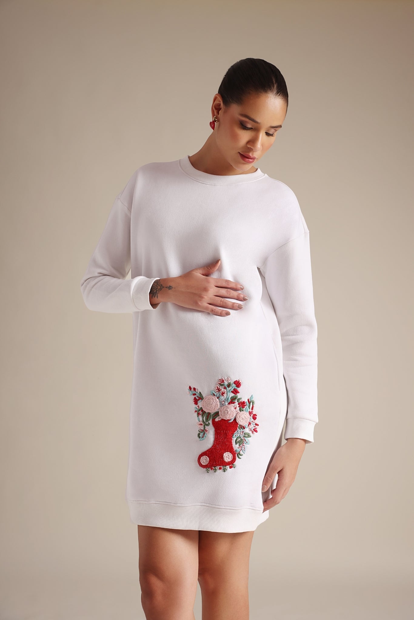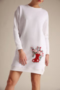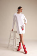 A cozy white sweatshirt dress adorned with a red floral stocking motif.